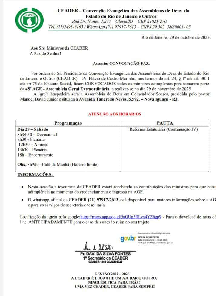 CEADER Realizou sua 249ª Assembleia Geral em Santo Antônio de Pádua – RJ A Convenção Evangélica das Assembleias de Deus do Estado do Rio de Janeiro e Outros (CEADER) realizou sua 249ª Assembleia Geral