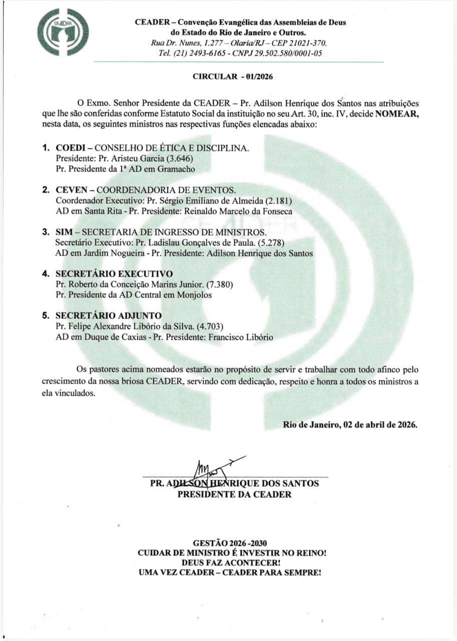 Um canal de comunicação direta com o nosso Presidente, Pr. Adilson Henrique dos Santos, onde você fica a par de tudo que acontece na CEADER